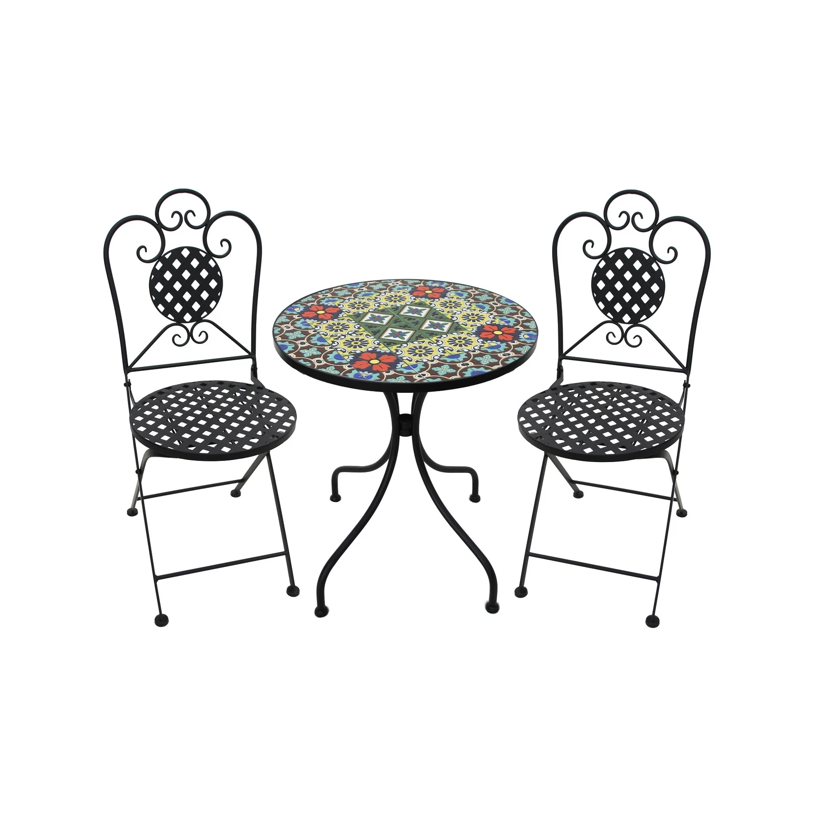 Elegant and classic design, this 3 piece mosaic bistro setting is a ideal addition to your garden or courtyard. Made from powder coated steel frame making it strong and durable. The table features beautiful mosaic tile design which is complimented by the curved legs and chairs. Easy to store the chairs fold flat when not in use.