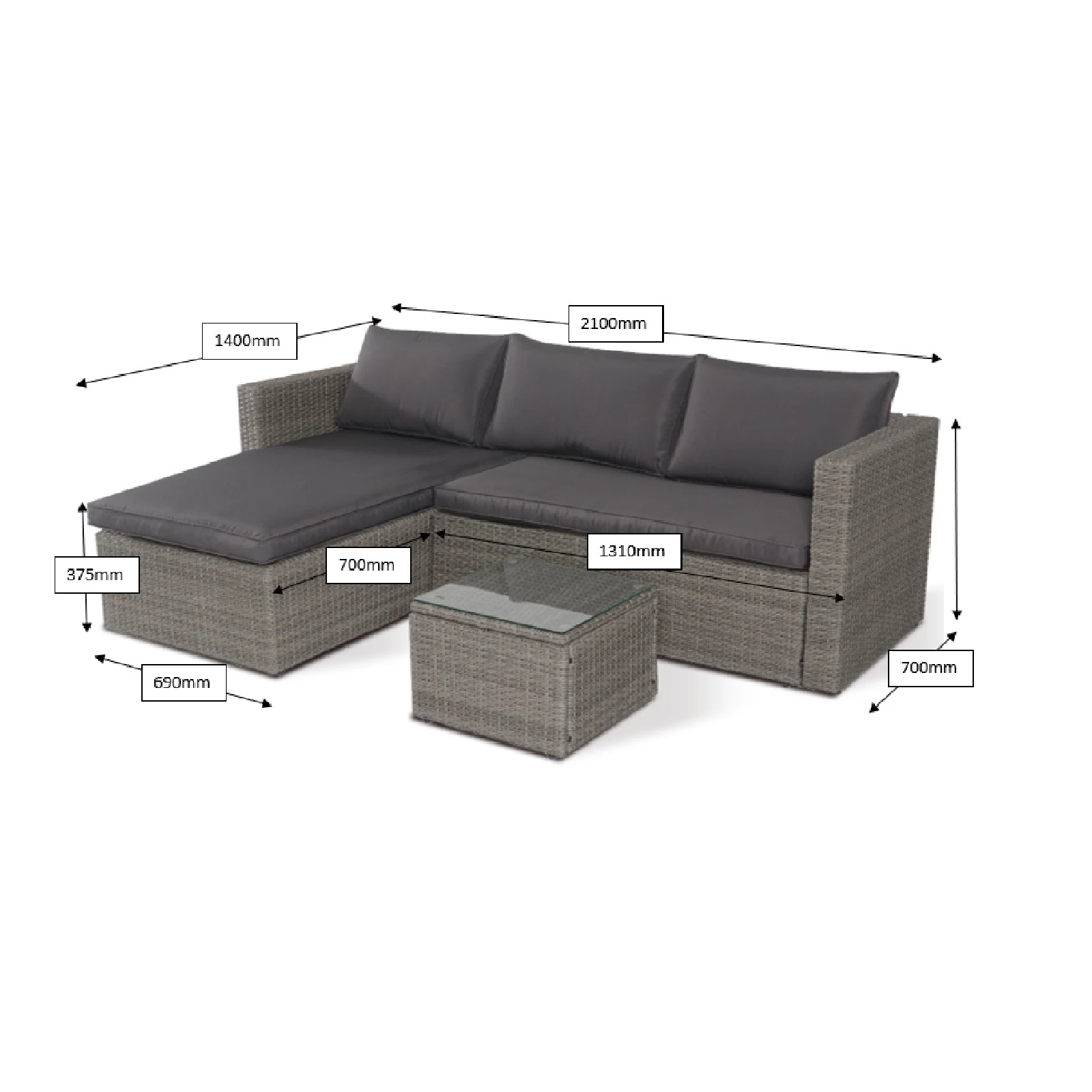 Chaise lounge: Width – 80cm, Depth – 140cm, Height – 62cm