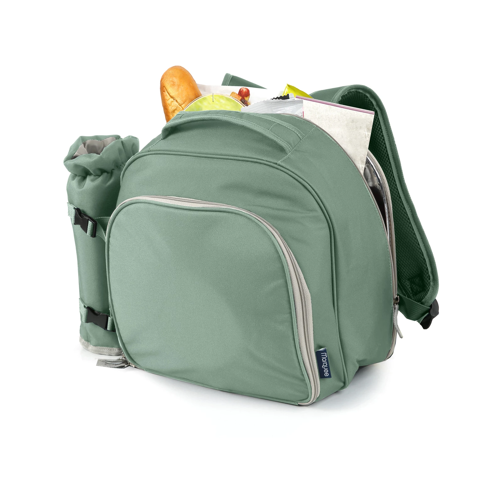 - Front zippered compartment includes: 4 white plates, 4 knives, 4 forks, 4 spoons, 4 glasses, 1 wine opener.